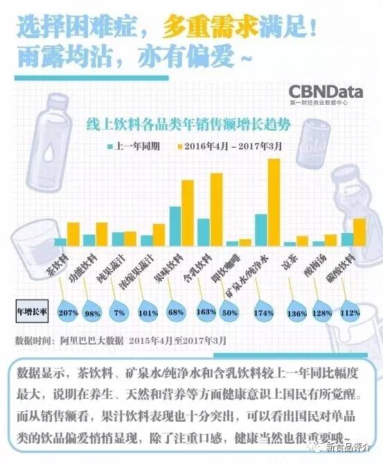 近年來(lái),受到國(guó)民健康意識(shí)的驅(qū)動(dòng),以及國(guó)民消費(fèi)品質(zhì)化的趨勢(shì)影響,飲料市場(chǎng)推陳出新加速,但即使是在飲品選擇眾多的情況下,消費(fèi)者亦有既定的選擇偏好區(qū)間。根據(jù)CBNData《報(bào)告》顯示,2017年線上各品類(lèi)飲料銷(xiāo)量是2016年同期的兩倍有余,其中,茶飲料、含乳飲料和礦泉水/純凈水銷(xiāo)量增速分別位列前三,其中,茶飲料得益于茶文化在消費(fèi)者心中的健康形象;含乳飲料憑借益生菌等健康概念打開(kāi)“城市亞健康”一族的熱門(mén)市場(chǎng);而礦泉水/純凈水也通過(guò)包裝和品質(zhì)上的升級(jí)進(jìn)軍市場(chǎng)。