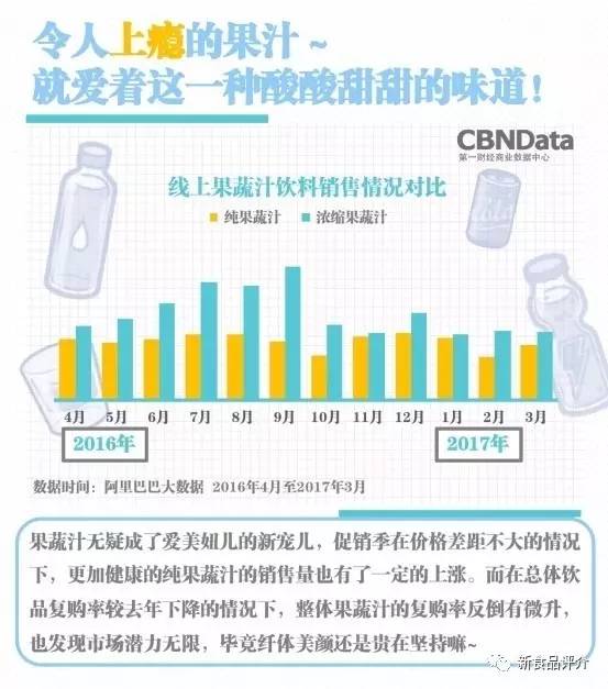 與此同時(shí),在各品類(lèi)飲料中,唯果蔬汁的復(fù)購(gòu)率是較2016年同期有所增長(zhǎng)的。可見(jiàn),在整體市場(chǎng)大量新品涌入,各品類(lèi)飲料的目標(biāo)受眾均或多或少被分流時(shí),主打健康品質(zhì)概念果蔬汁品牌的品牌忠誠(chéng)度較為鞏固,也有可能是消費(fèi)者的選擇尚有限,從線上品類(lèi)分布來(lái)看目前純果蔬汁市場(chǎng)上占據(jù)較多的是混合果蔬汁和橙汁,果蔬汁仍是品質(zhì)升級(jí)后的潛力市場(chǎng),值得期待更多待開(kāi)發(fā)的天然產(chǎn)品。。